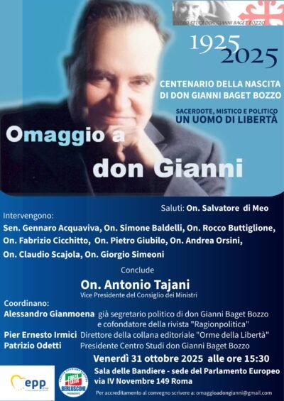 Con motivo del centenario del nacimiento del politólogo y eurodiputado Don Gianni Baget Bozzo (1925-2009), el pasado 31 de octubre se celebró en Roma, en la Oficina de Enlace en Italia del Parlamento Europeo, el congreso titulado: «Homenaje a Don Gianni: sacerdote, místico y político. Un hombre de libertad».